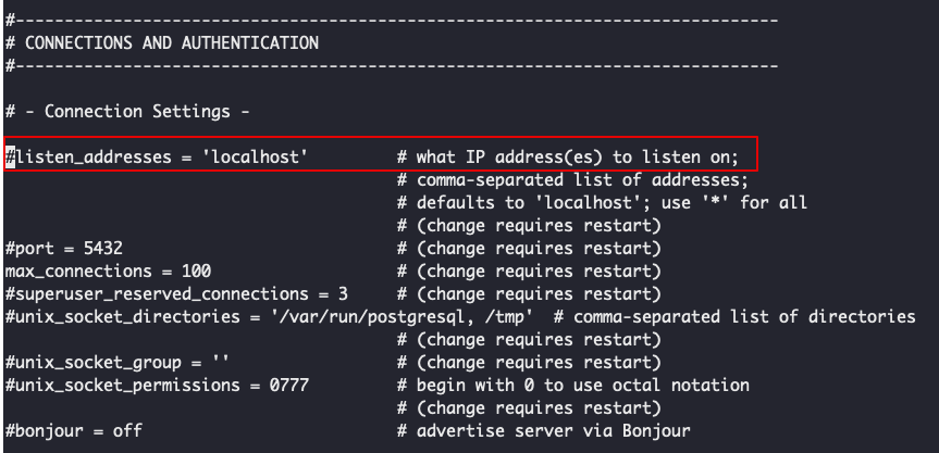 해당 파일을 열어 listen_addresses = 'localhost' 로 설정 되어있으며, 해당 부분을 listen_addresses = '*' 으로 수정시 원격 접속이 가능하다.