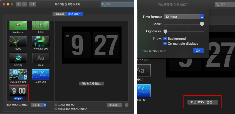 설치 완료 후 시스템 환경설정에서 "데스크톱 및 화면 보호기"로 들어가서 Fliqlo를 선택 및 "화면보호기 옵션"을 통해 설정을 하고 사용하면 된다.