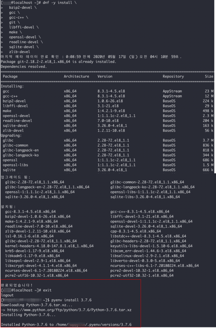 이럴때 "dnf -y install bzip2-devel gcc gcc-c++ git libffi-devel make openssl-devel readline-devel sqlite-devel zlib-devel" 으로 Dependency(의존성)에 의해 미설치가 된 부분을 추가적으로 설치하자.