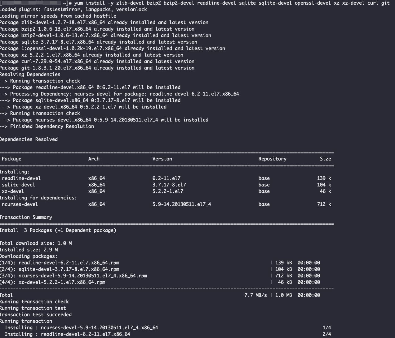 $ yum install -y bzip2 bzip2-develcurl gcc gcc-c++ git libffi-devel make openssl-devel readline-devel sqlite sqlite-devel xz xz-devel zlib-devel