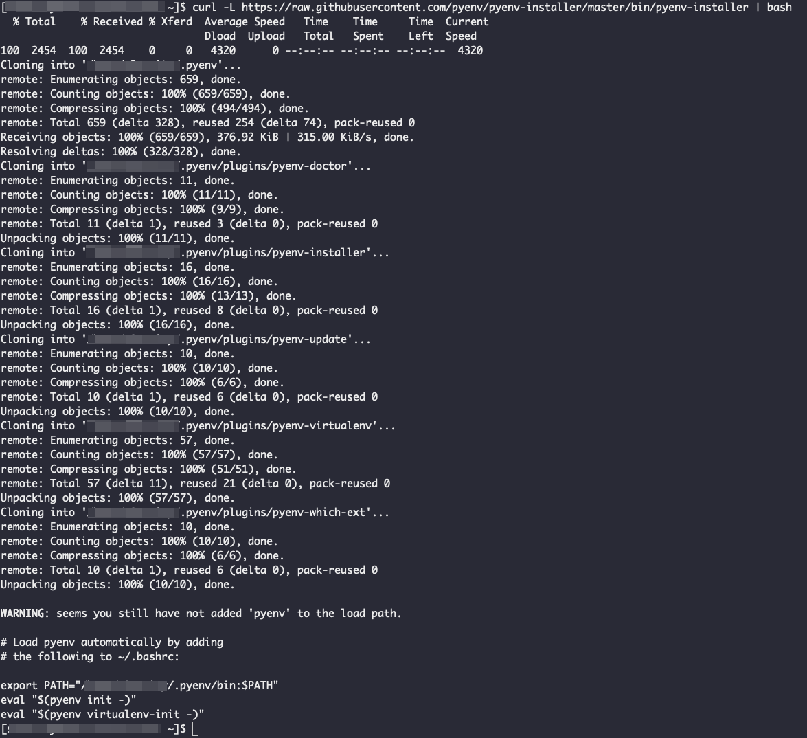 $ curl -L https://raw.githubusercontent.com/pyenv/pyenv-installer/master/bin/pyenv-installer | bash