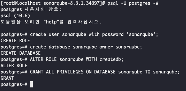 먼저 psql을 이용하여 PostgreSQL로 접속 하고 sonarqube 계정과 데이테베이스를 생성 및 권한을 주도록 하자.