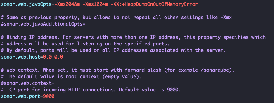 - sonar.web.javaOpts=-Xmx4096m -Xms2048m -XX:+HeapDumpOnOutOfMemoryError
