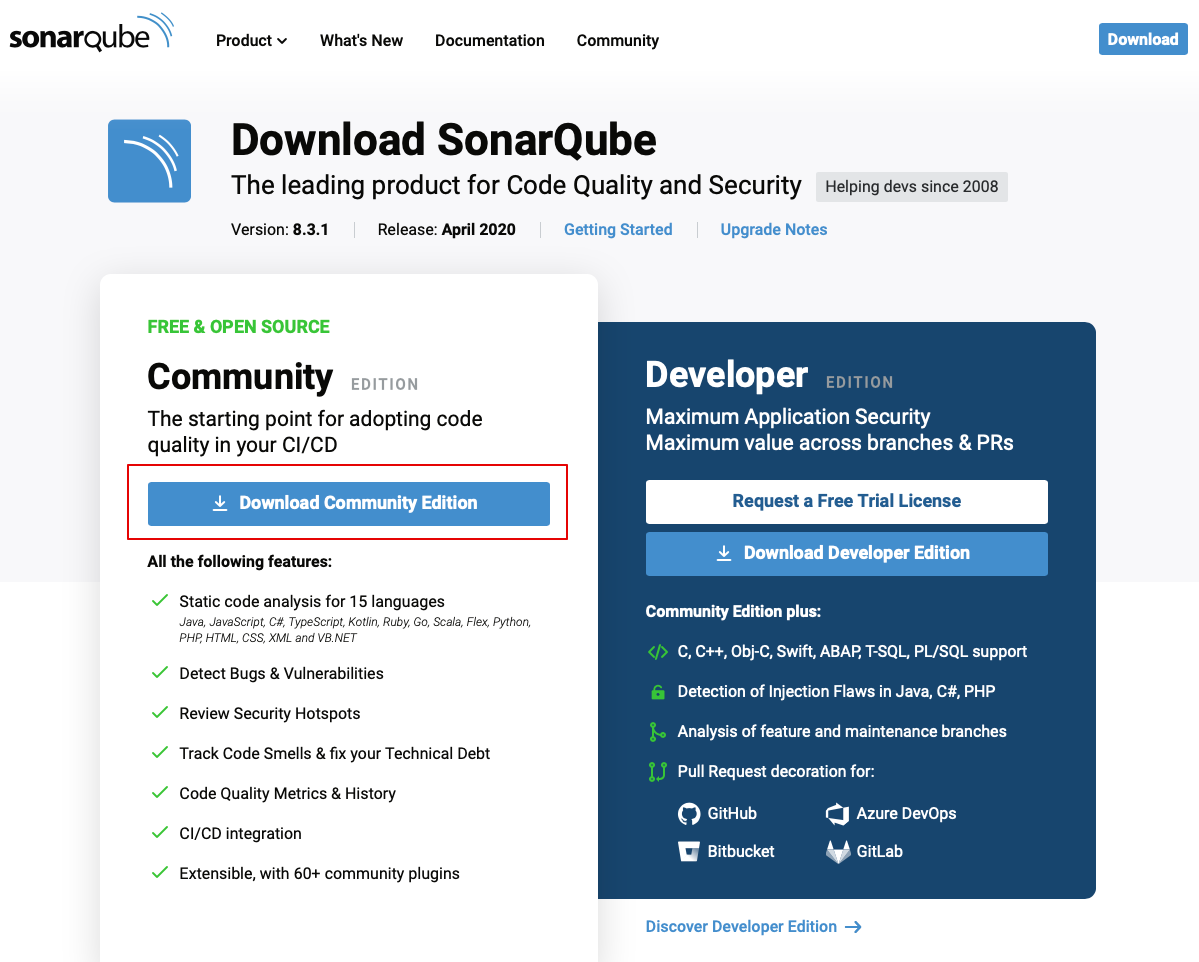 SonarQube 웹 페이지에서 무료로 사용 가능한 Community Edition을 다운로드하여 사용할 수 있다.