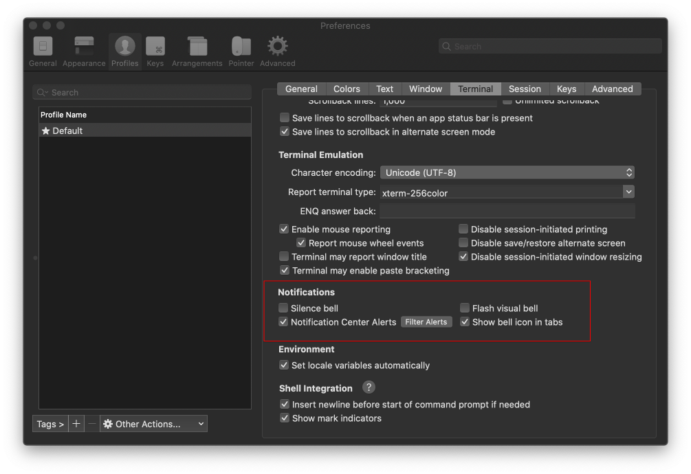 해당 경로는 " iTerm2 실행 > Preferences > Profiles > Terminal > Notifications"