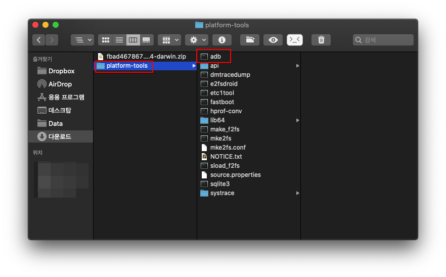 다운로드한 파일을 압축 해제하면 platform-tools라는 폴더가 생기면서 그 안에 여러 Android(안드로이드) 플랫폼과 연결하여 사용할 수 있는 여러 가지 Tool(도구)이 들어 있다.