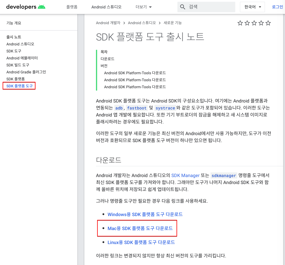 Brew를 통해서가 아니라 Android(안드로이드) 개발자(Developers) 홈페이지에서 SDK 플랫폼 도구를 OS 버전에 맞게 다운로드하여 사용할 수 있다.
