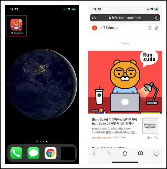 아이폰(iPhone)에서도 안드로이드(Android) 바로가기 아이콘처럼 사파리 브라우저(Safari Brower)를 이용하여 만들 수 있다.