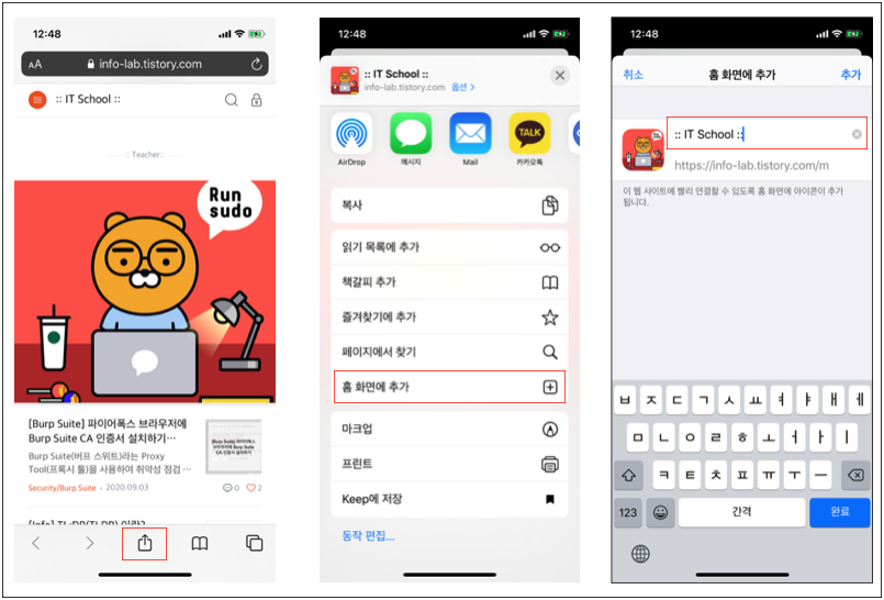 접속 후 사파리 브라우저 하단을 보면 "내보내기 버튼" 클릭 "홈 화면에 추가"를 클릭 후 "바로가기 이름"을 작성해주도록 하자.