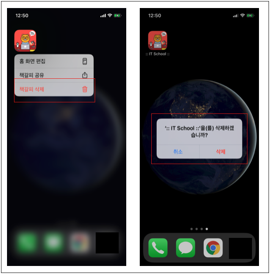 더 이상 바로가기 아이콘이 필요 없는 경우 App(앱)을 삭제하는 것과 마찬가지로 해당 아이콘을 잠시 눌러 메뉴 활성화 후 "책갈피 삭제"를 클릭하여 해당 아이콘을 삭제해주면 된다.