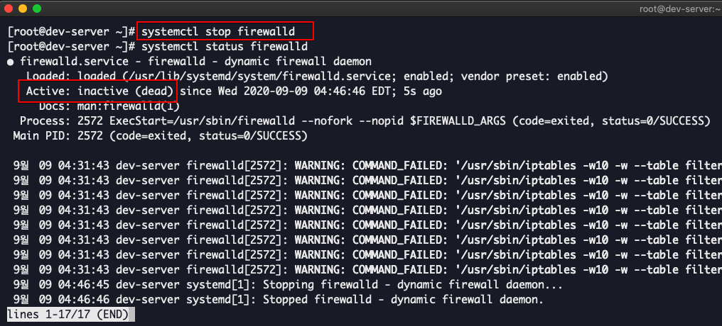 실행 시"inactive(dead)"으로 현재 Firewall은 중지된 것을 확인할 수 있다.