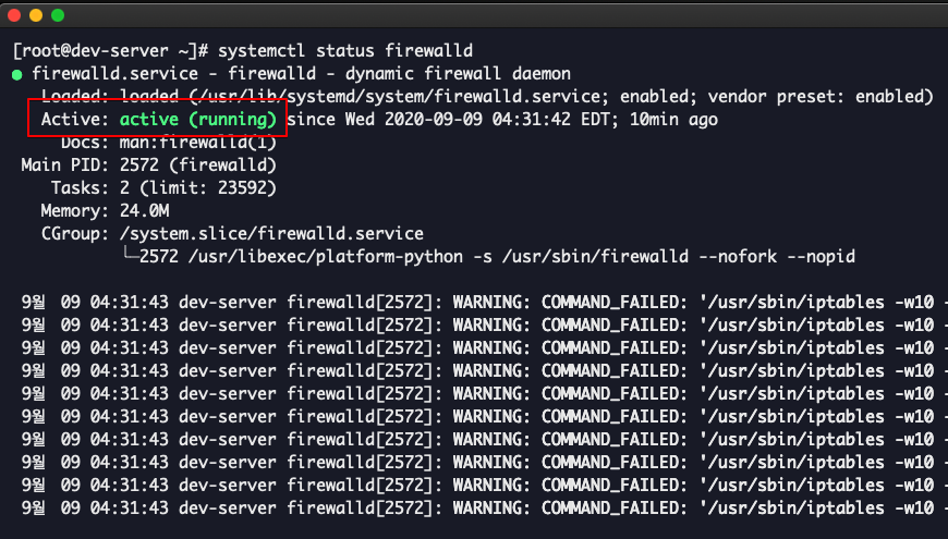 실행 시 "active(running)"으로 현재 Firewall은 구동 중인 것을 확인할 수 있다.