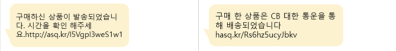 o (유포형태) 택배 배송확인, 주소확인 등을 가장하여 스미싱 문자 내 악성 사이트를 클릭 유도