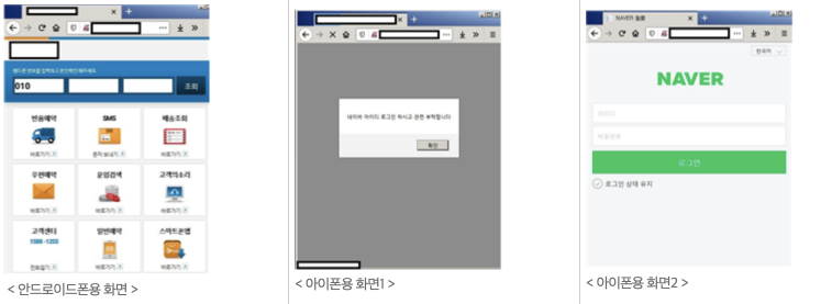 - (안드로이드폰 + 아이폰(네이버 계정 탈취)) 스미싱 문자에 포함된 URL에 접속하면 안드로이드 폰은 악성앱 유포․설치를 유도하고, 아이폰은 네이버 로그인을 사칭하는 페이지로 접속하여 계정을 탈취