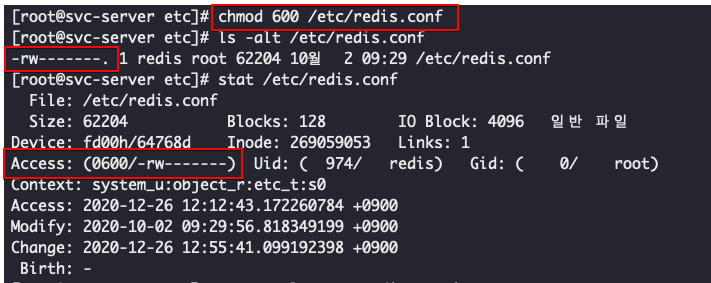 그럼에 따라 해당 Redis 설정 파일은 소유자만이 읽기 및 쓰기 권한을 가질 수 있도록 설정을 하도록 하자.