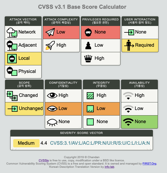 - https://itschool-info-lab.github.io/cvss/#CVSS:3.1/AV:L/AC:L/PR:N/UI:R/S:U/C:L/I:L/A:N