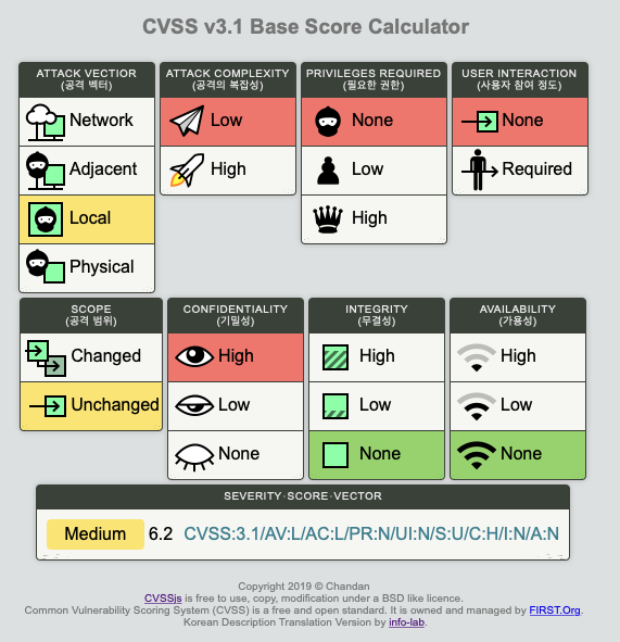 o 6.2 MEDIUM CVSS:3.1/AV:L/AC:L/PR:N/UI:N/S:U/C:H/I:N/A:N