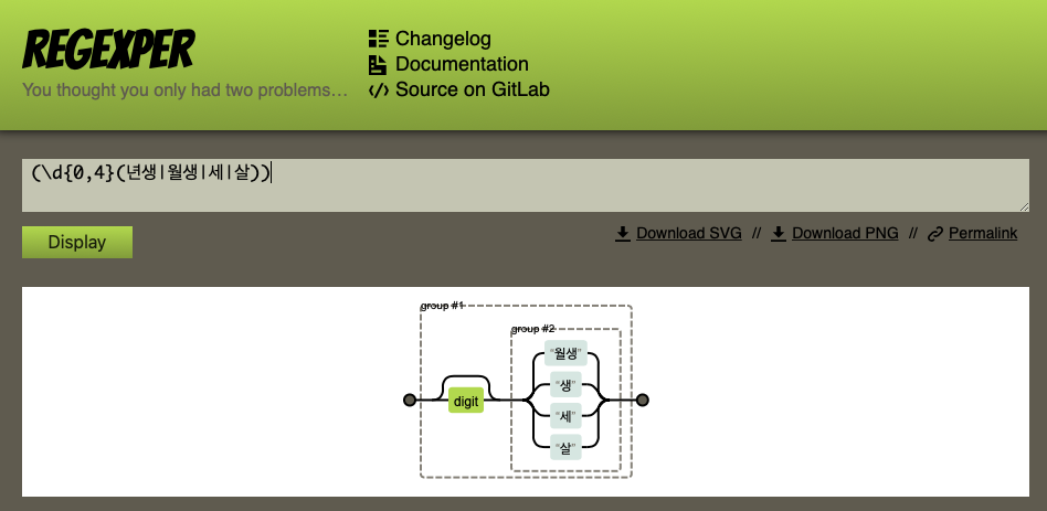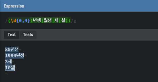 - 정규표현식 : (\d{0,4}(년생|월생|세|살))