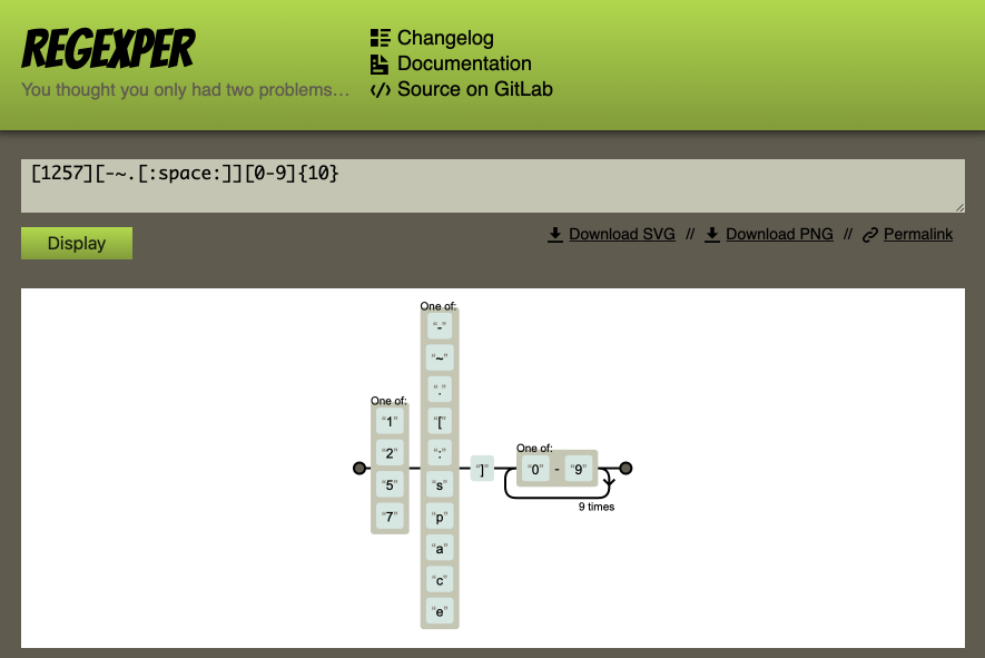 - 정규표현식 : [1257][-~.[:space:]][0-9]{10}