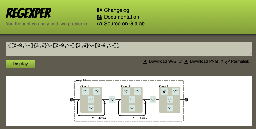 - 정규표현식 : ([0-9,\-]{3,6}\-[0-9,\-]{2,6}\-[0-9,\-])