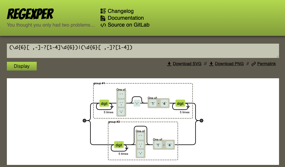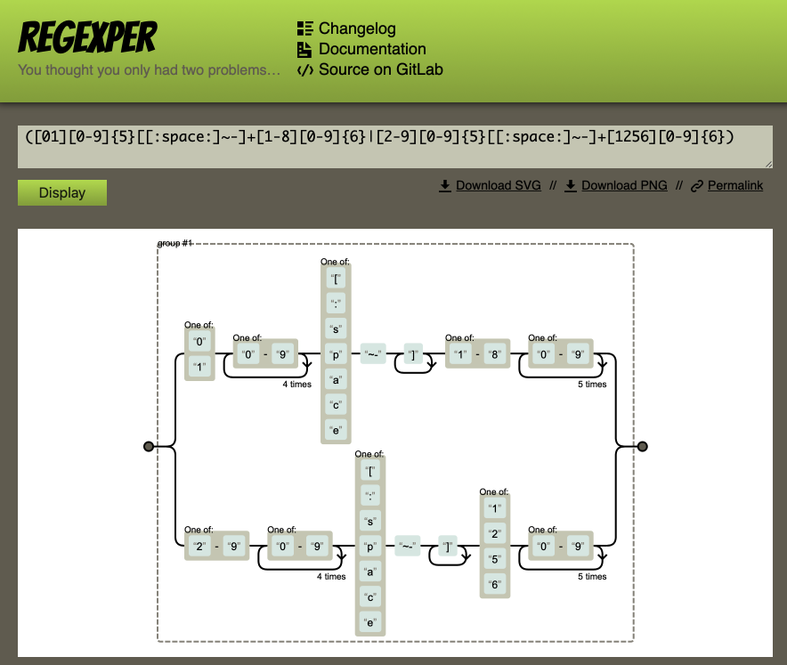 - 정규표현식 : ([01][0-9]{5}[[:space:]~-]+[1-8][0-9]{6}|[2-9][0-9]{5}[[:space:]~-]+[1256][0-9]{6})