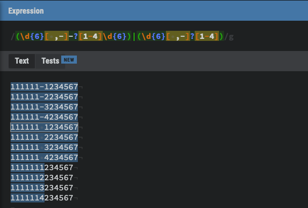 - 정규표현식 : (\d{6}[ ,-]-?[1-4]\d{6})|(\d{6}[ ,-]?[1-4])