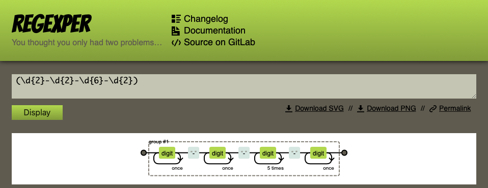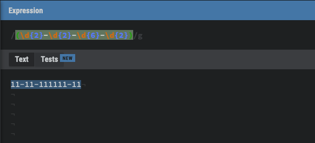 - 정규표현식 : (\d{2}-\d{2}-\d{6}-\d{2})