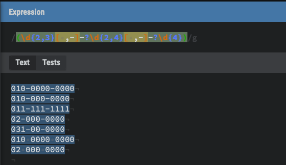 - 정규표현식 : (\d{2,3}[ ,-]-?\d{2,4}[ ,-]-?\d{4})