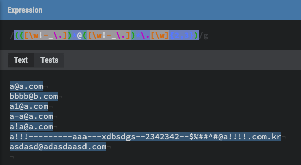 - 정규표현식 : (([\w!-_\.])*@([\w!-_\.])*\.[\w]{2,3})