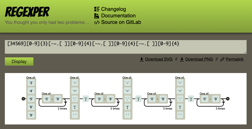 - 정규표현식 : [34569][0-9]{3}[-~.[ ]][0-9]{4}[-~.[ ]][0-9]{4}[-~.[ ]][0-9]{4}