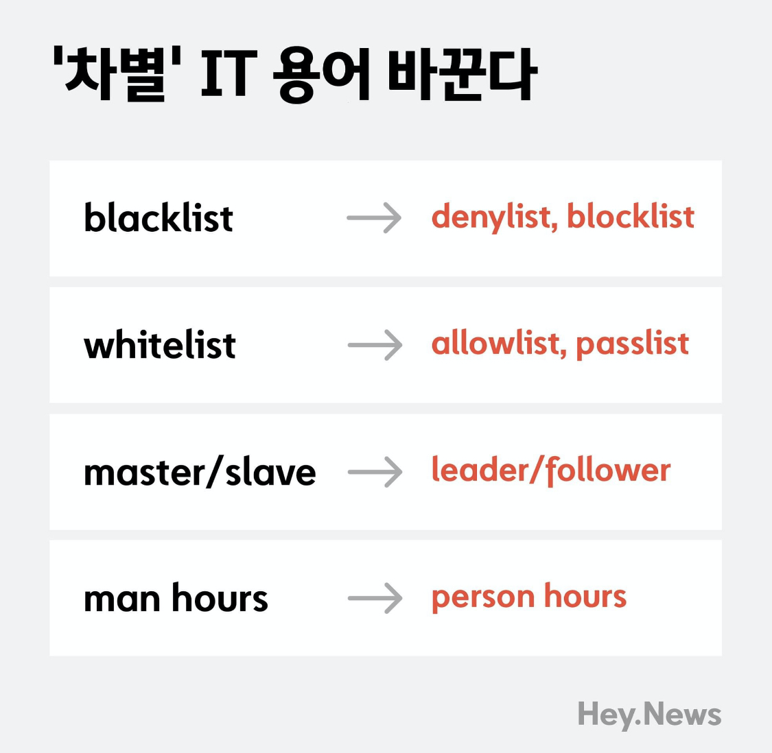 블랙리스트는 접근을 차단할 때, 화이트리스트는 허용할 때 쓰는데, ‘블랙‘과 ‘화이트‘가 피부색으로 해석될 수 있어서다. 다른 장치를 제어할 때 쓰는 ‘마스터(master)‘와 ‘슬레이브(slave)‘같은 용어도 ‘리더(leader)‘와 ‘팔로워(follower)’ 등으로 대체할 것을 추천했다.