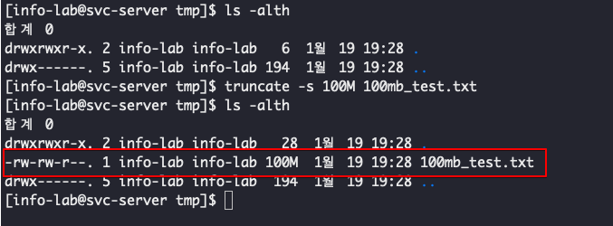 truncate 명령어를 이용하여 100MB의 크기를 가진 파일 생성해보도록 하자.