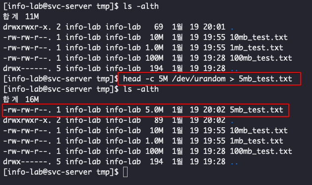 head 명령어를 이용하여 5MB의 크기를 가진 파일 생성해보도록 하자.