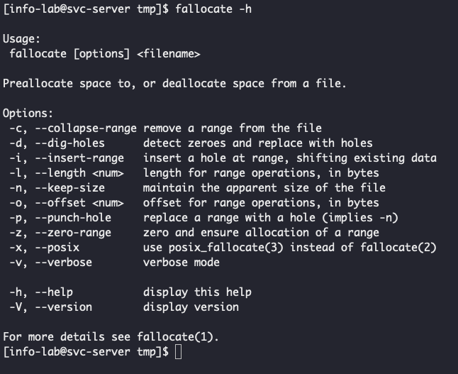 fallocate 명령어에 -l 옵션 후 Byte 기준으로 원하는 크기(Size)의 파일을 생성할 수 있다.