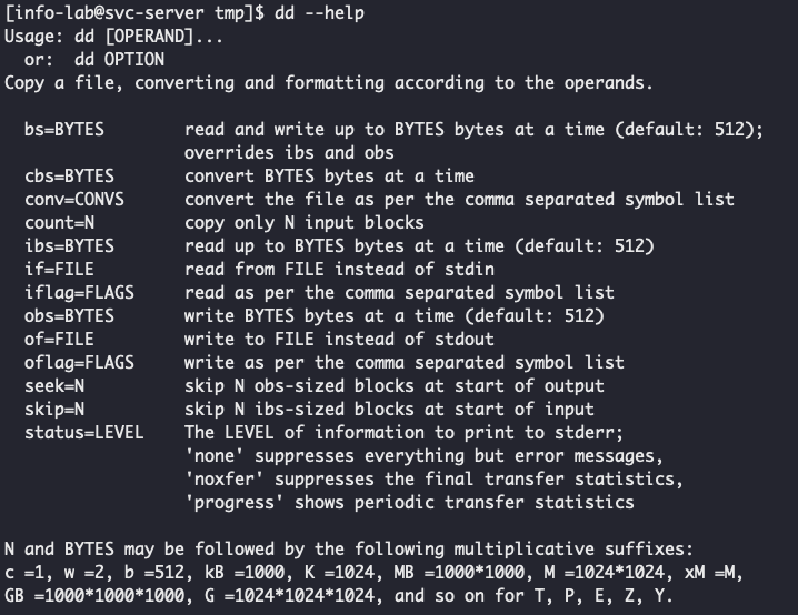 dd 명령어로는 옵션에 따라 위에 소개한 2개 명령어보다는 다른 역할로 많이 사용하고 있음에 따라, 가능하면 위에 소개한 2개 명령어를 이용하도록 하자.