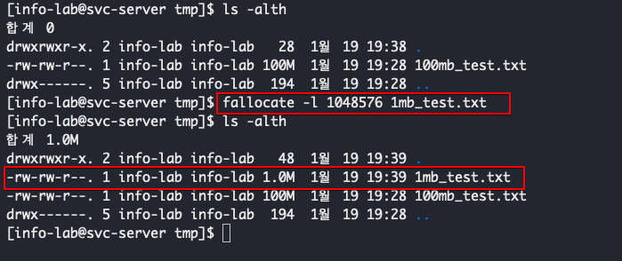 fallocate 명령어를 이용하여 1MB의 크기를 가진 파일 생성해보도록 하자.