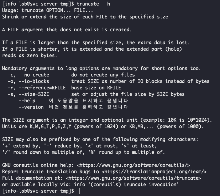 truncate 명령어에 -s 옵션 후 "K, M, G, T" 혹은 "KB, MB, GB, TB"를 통해서 원하는 크기(Size)의 파일을 생성할 수 있다.