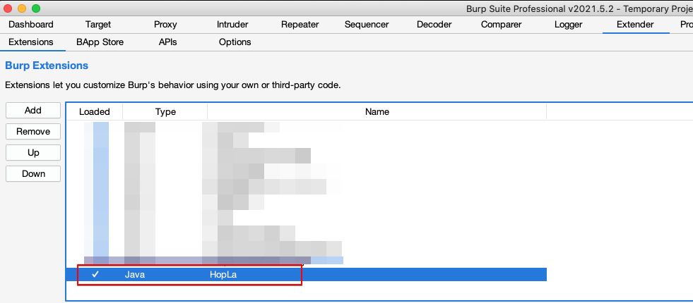https://github.com/synacktiv/HopLa/releases 해당 경로에서 jar 파일을 다운로드 받아서 Extender tab에서 추가 해주면 된다.
