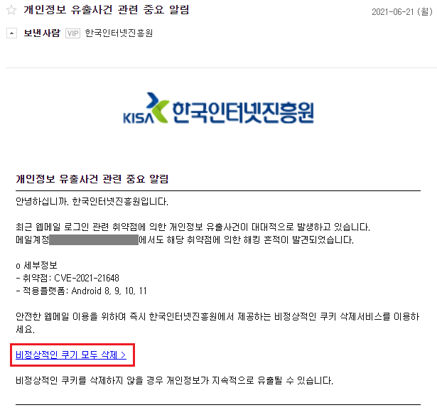 - 한국인터넷진흥원(KISA)을 사칭하여 '개인정보 유출사건 관련 중요 알림'이라는 제목으로 피싱 메일이 유포되고 있으며, 해킹된 메일 계정 조치를 위해 본문에 삽입된 링크를 클릭하도록 유도