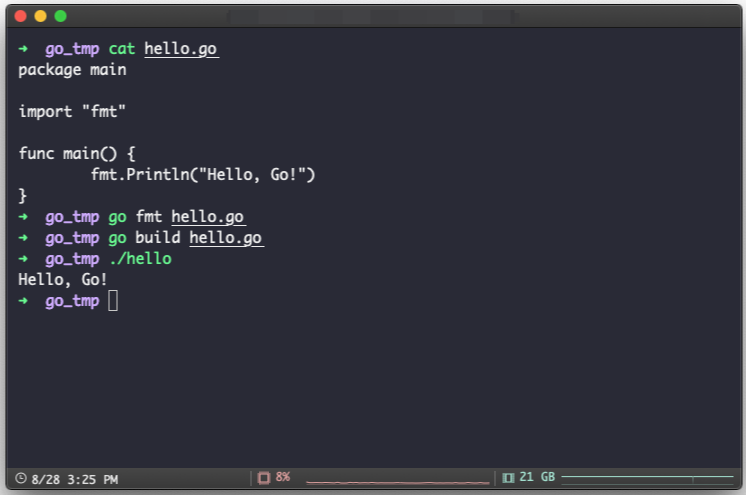 - $ go fmt hello.go을 실행(fmt 명령어는 필수 과정이 아니며, IDE를 사용하는 경우 자동으로 처리해준다.)
