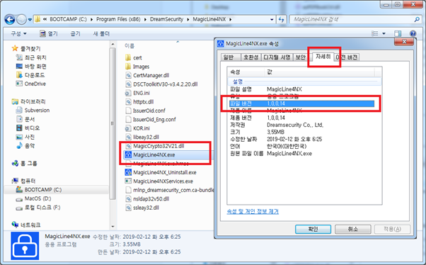 - MagicLine4NX에 마우스 오른쪽 버튼 클릭 – 속성 – 자세히 탭 클릭 – 파일 버전 확인