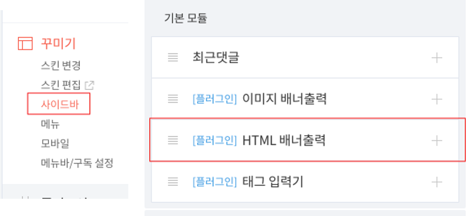 이중 기본 모듈에 "[플러그인] HTML 배너출력" 항목 옆에 있는 플러스(+) 버튼을 클릭하자.