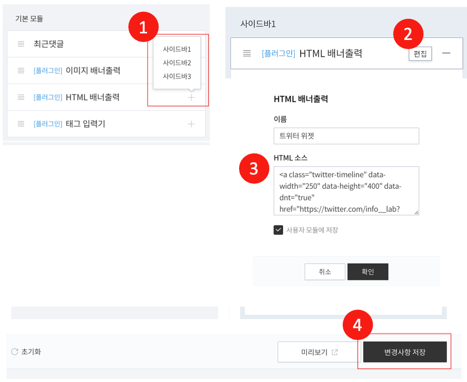 클릭 후 사이드바 선택 > HTML 배너출력 편집 > 복사한 트위터 위젯 코드 추가 및 이름 작성, "사용자 모듈에 저장" 체크 > 변경사항 저장을 진행하도록 하자.