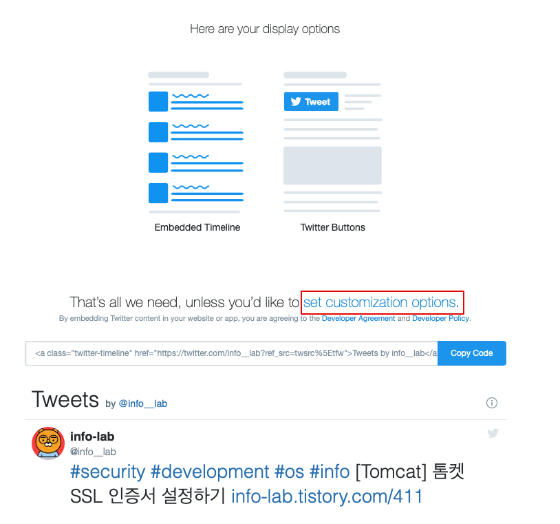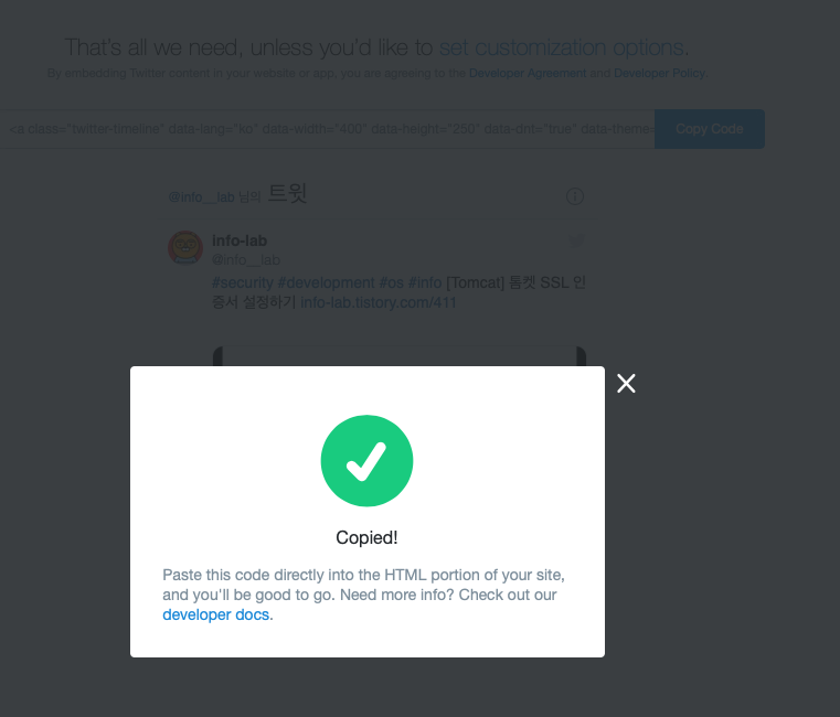 업데이트 완료 후 생성된 트위터 위젯 코드를 복사하자.