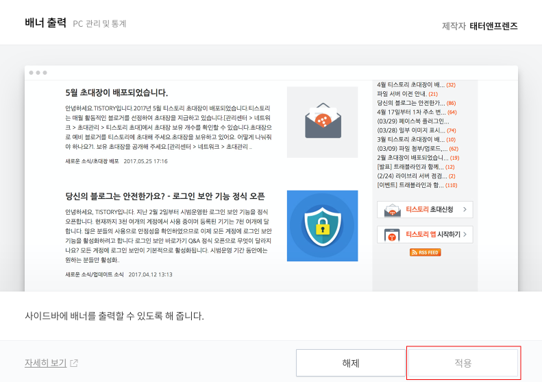 4. 티스토리 관리자 > 사이드바 > 배너출력 설정 하기