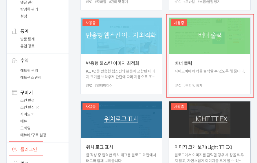 1. 티스토리 관리자 > 플러그인 > 배너출력 설정 하기
