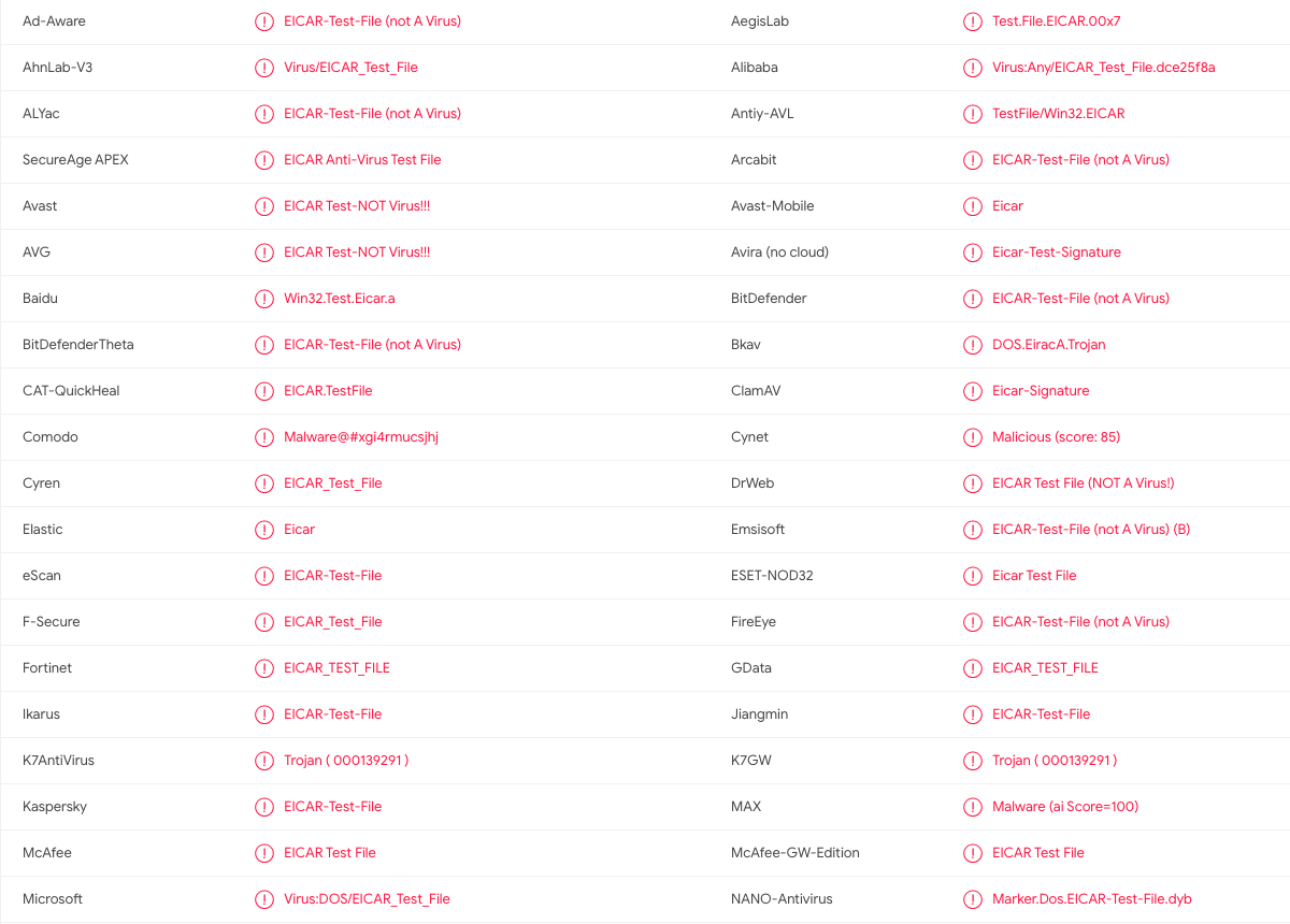 해당 파일로 텍스트 파일로 백신 검사 테스트를 진행해보면 백신 탐지명이 대부분 "EICAR-Test-File"로 확인 된다.