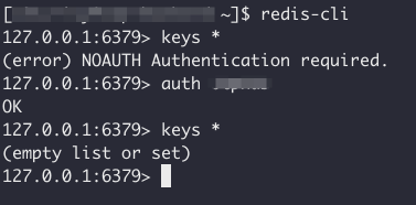 암호가 설정이 되어있는경우 Error가 발생되며 인증이 필요하다고 알려준다.((error) NOAUTH Authentication required.)